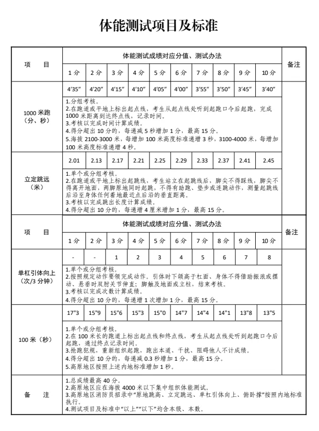 考核科目包括单杠引体向上、1000米跑、100米跑、立定跳远四项内容(标准见附件)。