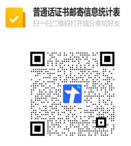 未及时填写领取方式且无法到现场领取的考生,请扫描下方二维码,准确填写证书邮寄信息统计表,待本中心整理后,采取邮寄到付方式将证书邮寄给考生。(邮寄过程中可能会出现证书丢失情况,按照有关规定,普通话水平测试等级纸质证书遗失的不予补发,请慎重选择)。因选择邮寄方式造成证书丢失的,责任自行承担。
