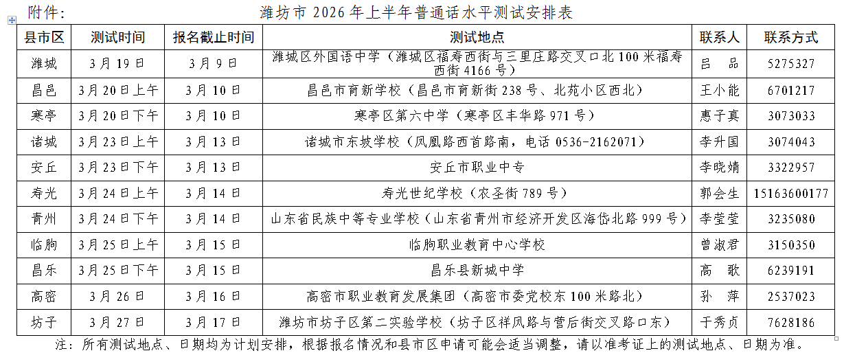 根据潍坊市《关于开展2026年上半年普通话水平测试的通知》要求,现将寿光市普通话水平测试工作有关事宜通知如下: