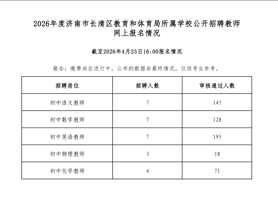 原标题:2026年度济南市长清区教育和体育局所属学校公开招聘教师网上报名情况(截至2026年4月23日16:00报名情况)