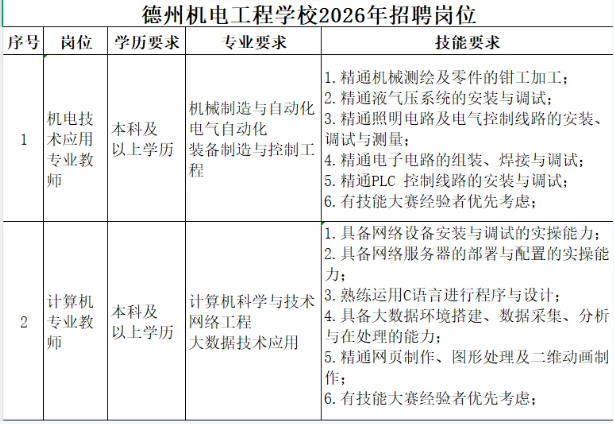原标题:德州机电工程学校2026年招聘简章