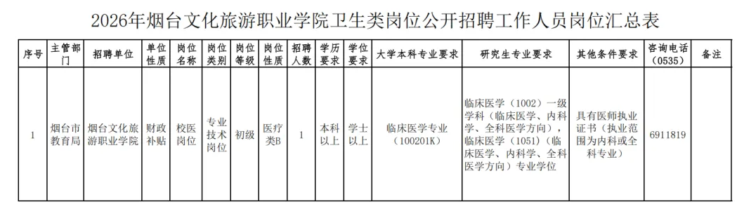 烟台文化旅游职业学院卫生类岗位公开招聘工作人员的岗位条件、招聘人数等具体要求见《2026年烟台文化旅游职业学院卫生类岗位公开招聘工作人员岗位汇总表》(附件2)。