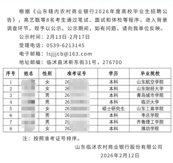 录用公示 | 2026年枣庄滕州农商银行高校毕业生招聘拟录用人员公示