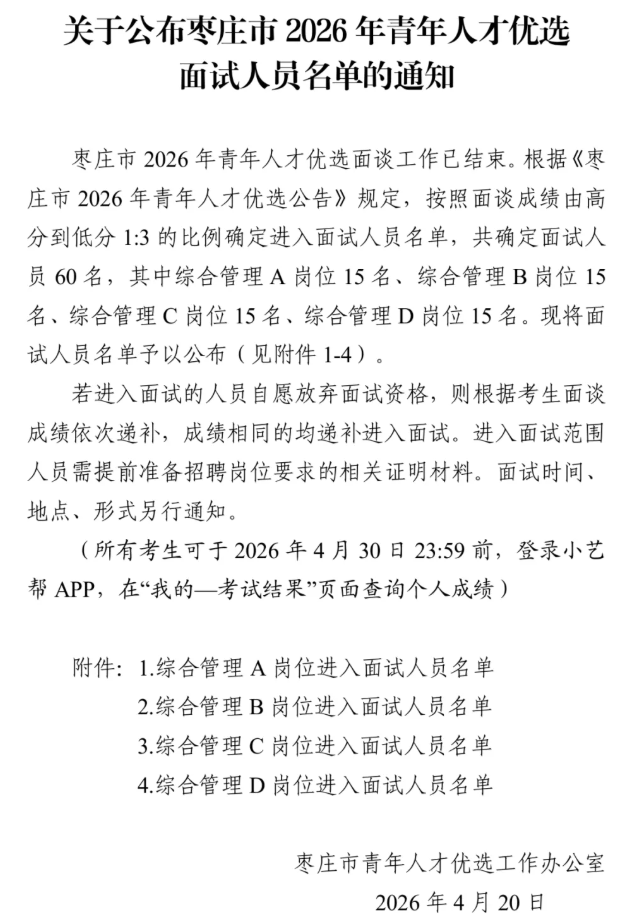 原标题:关于公布枣庄市2026年青年人才优选面试人员名单的通知
