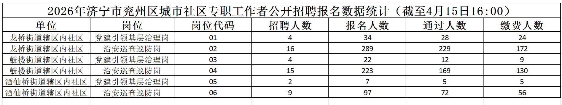 原标题:2026年济宁市兖州区城市社区专职工作者公开招聘报名数据统计(截至4月15日16:00)