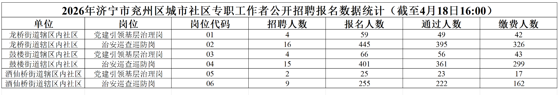 原标题:2026年济宁市兖州区城市社区专职工作者公开招聘报名数据统计(截至4月18日16:00)