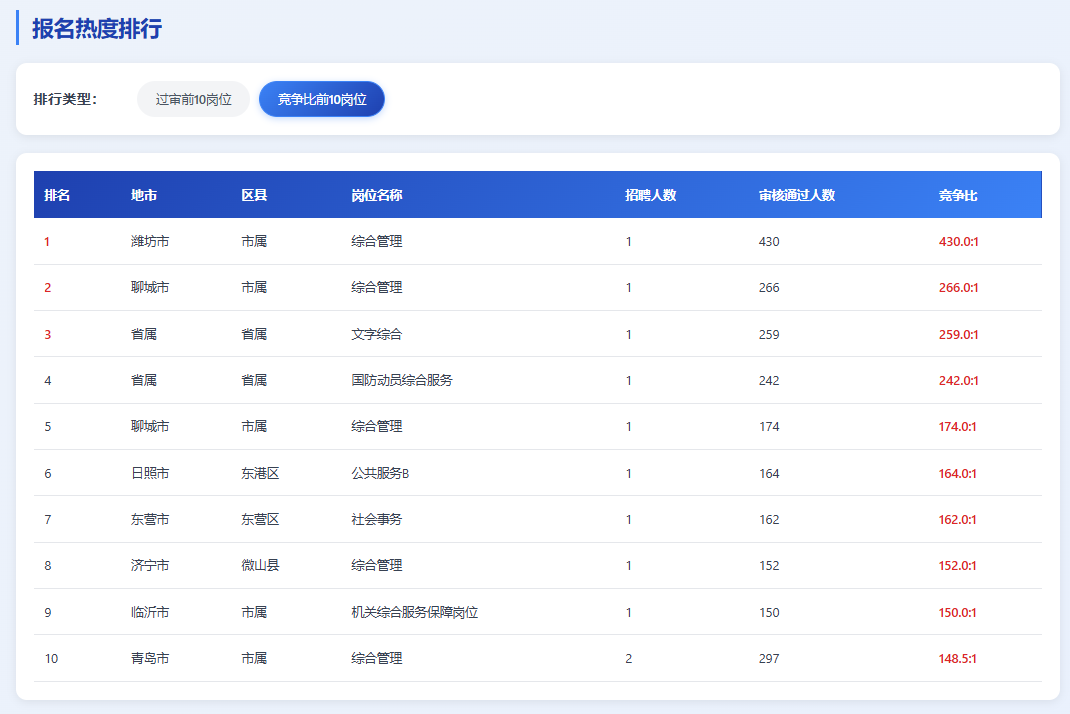 最高竞争比:430.0:1(岗位:潍坊市市属综合管理)