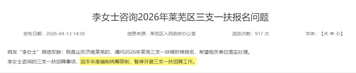 网友“李女士”微信反映:我是山东济南莱芜的,请问2026年莱芜三支一扶啥时候报名,希望相关单位落实处理。