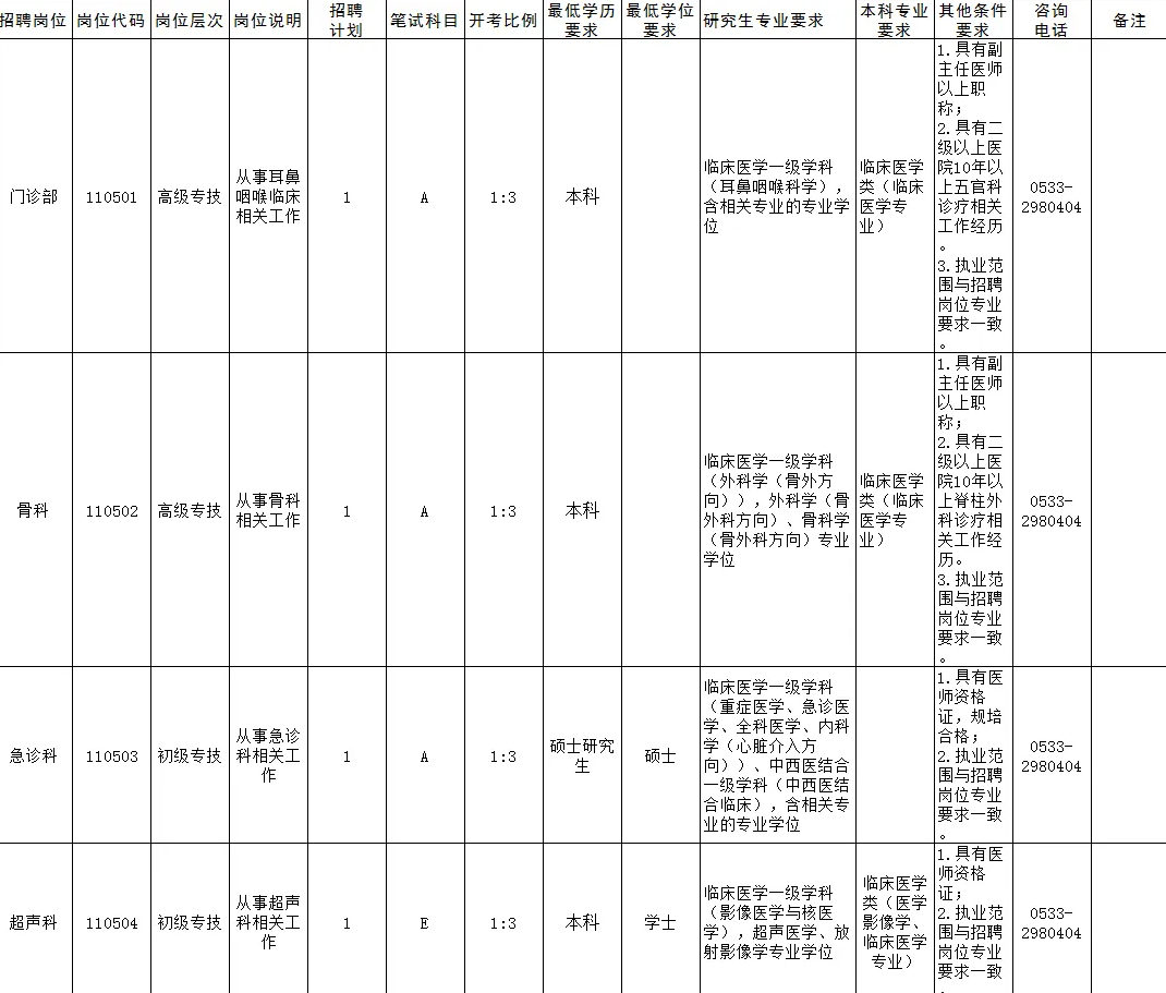 岗位咨询电话:淄博市第四人民医院人事科 0533-2980404